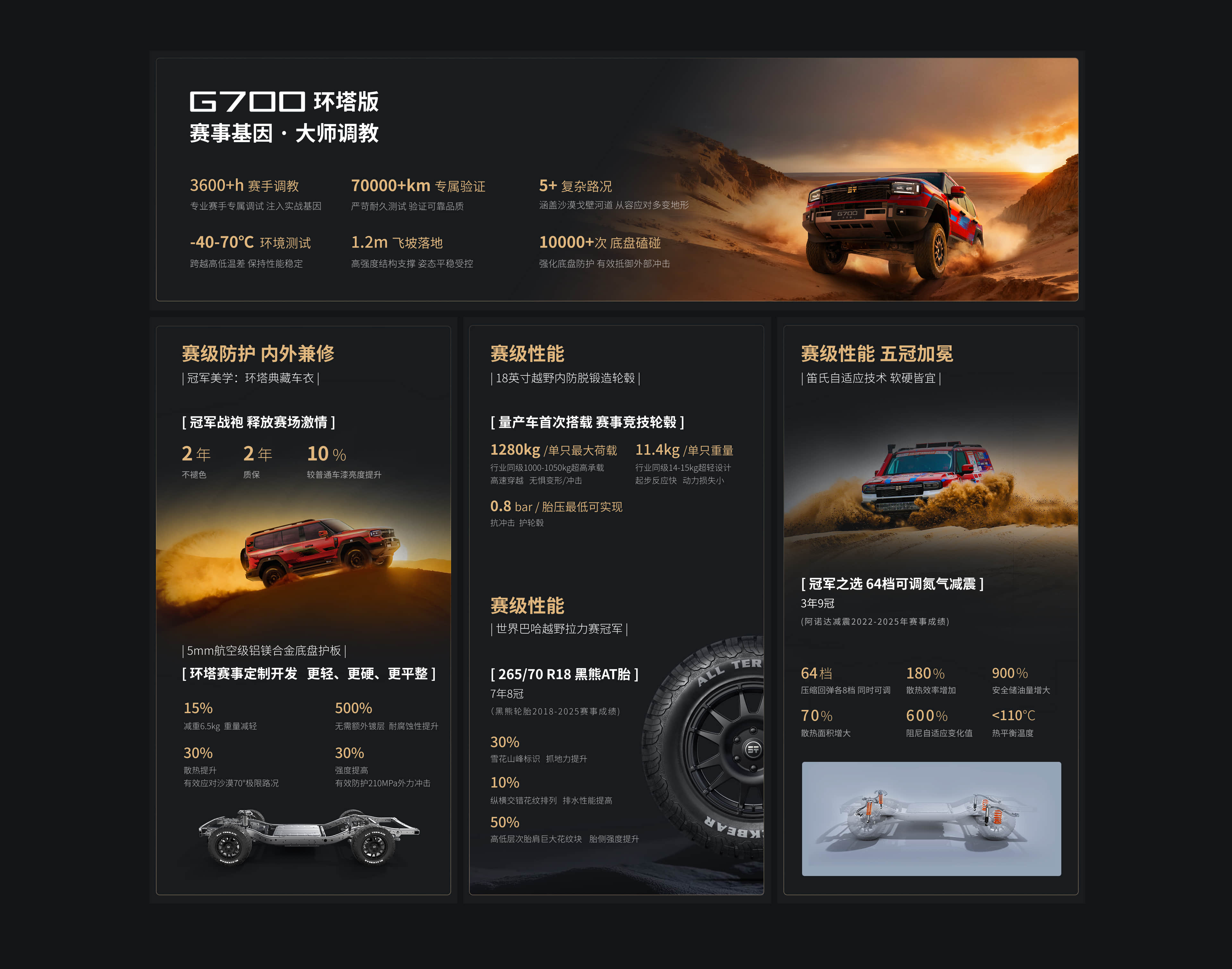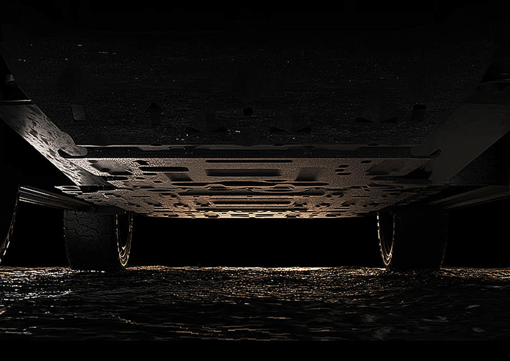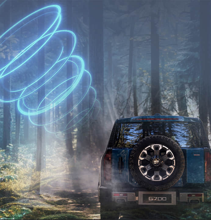 全系标配智能三把锁,前后电控牙嵌式差速锁+能量中锁,前中后三把锁电控联动,响应时间<100ms,三重锁定,征服全境