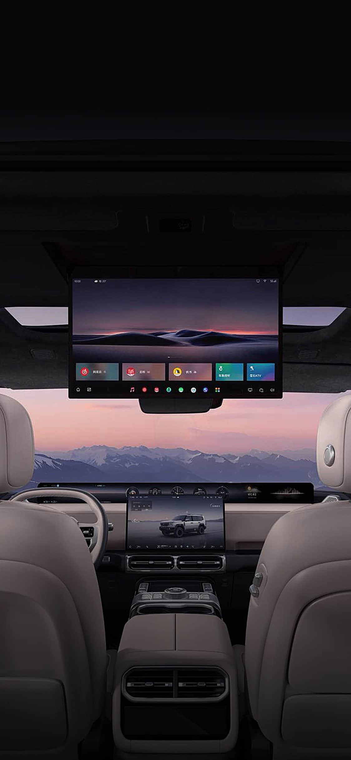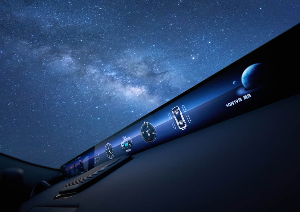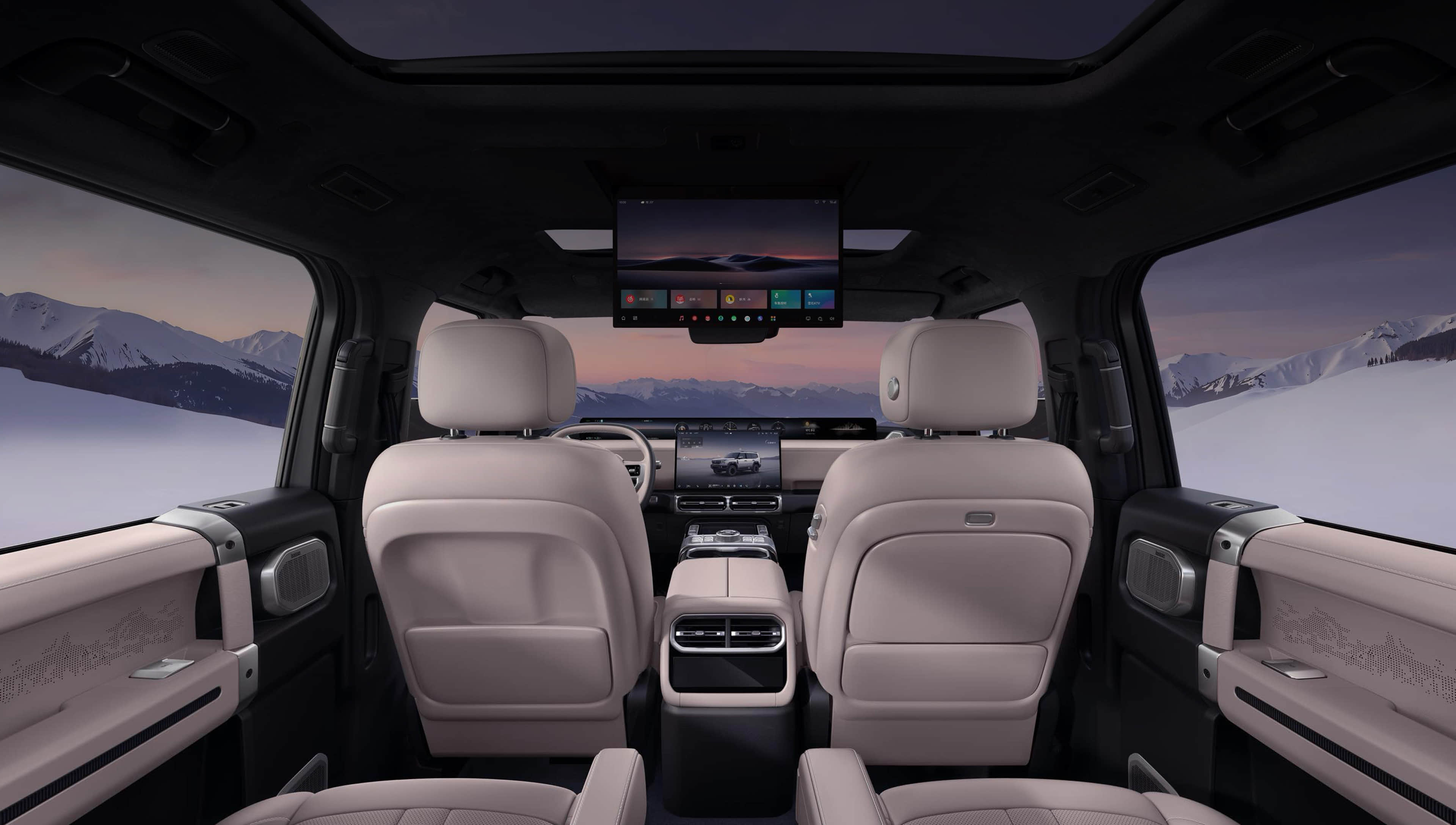 全车配备超77英寸巨幕级屏幕系统,前后排都有精彩。35.4英寸山脉天际屏、15.6英寸中控触控大屏、17.3英寸家庭影院大屏、8.88英寸后排空调屏
