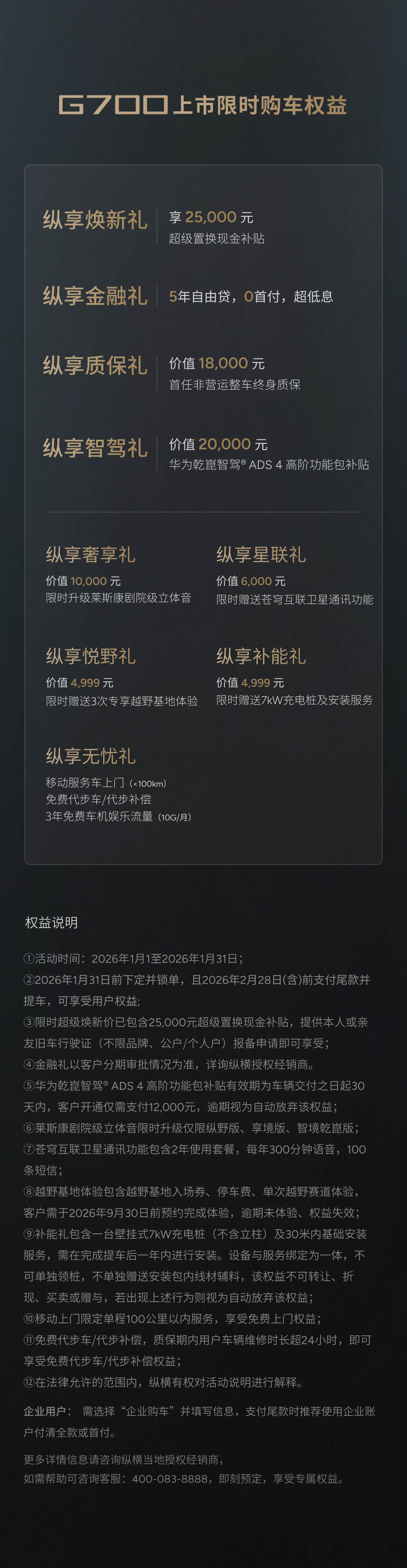 纵横G700,以“更硬核、更豪华、更智能、更尊享”启程越野新坐标。设计灵感源自喜马拉雅,内饰豪华。搭载鲲鹏超能混动CDM-O、智能三把锁与华为乾崑智驾® ADS 4,动力强悍,智能领先。提供环塔版等官方定制,尊享生态无界。